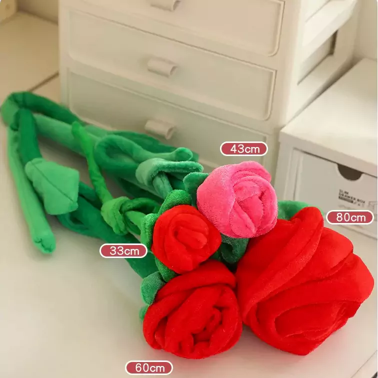 Эта плюшевая игрушка «Букет роз» тщательно изготовлена. Каждый «цветок» на самом деле представляет собой мягкую, очаровательную плюшевую игрушку, мягкую и приятную на ощупь, безворсовую и не вызывающую аллергии. Он связан искусственными зелеными листьями и упаковочной бумагой, что придает ему такой же атмосферный вид, как и настоящие цветы, но он гораздо более прочный и может храниться годами! Он бывает разных цветов — розовый, красный и таро-фиолетовый — каждый из них настолько успокаивающий, что очарует любую девушку.